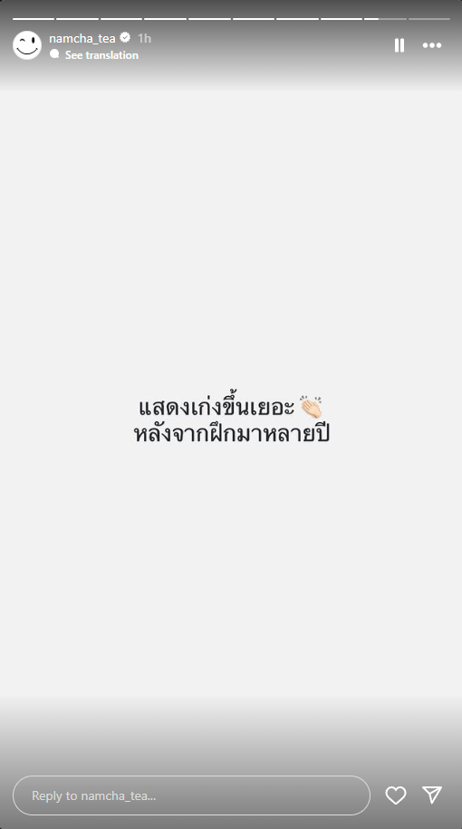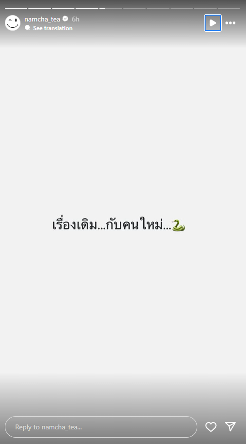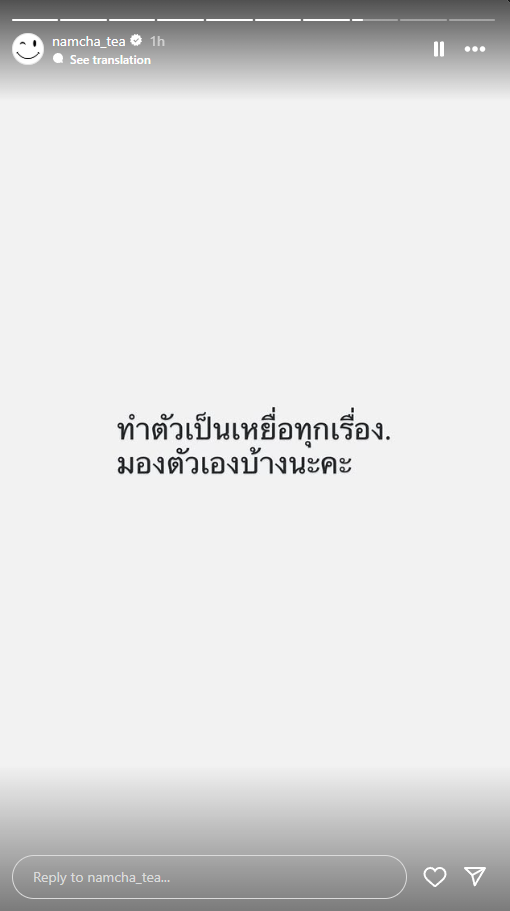 ล่าสุด “น้ำชา” โพสต์สตอรี่ถึงบุคคลหนึ่งว่า “เรื่องเดิมกับคนใหม่ (อีโมจิงู)” , “ทำตัวเป็นเหยื่อทุกเรื่อง มองตัวเองบ้างนะคะ” และ “แสดงเก่งขึ้นเยอะหลังจากฝึกมาหลายปี” ปิดท้ายด้วยการโพสต์สตอรี่ภาพอีโมจิงูตัวใหญ่ งานนี้ทำเอาโซเชียลลุกเป็นไฟว่าที่สาว “น้ำชา” โพสต์ถึงนั้นคือใครกันแน่