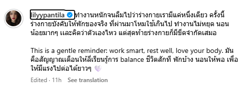This is a gentle reminder: work smart, rest well, love your body. มันคือสัญญาณเตือนให้ลี่เรียนรู้การ balance ชีวิตสักที พักบ้าง นอนให้พอ เพื่อให้มีแรงไปต่อได้ยาวๆ 🤍”