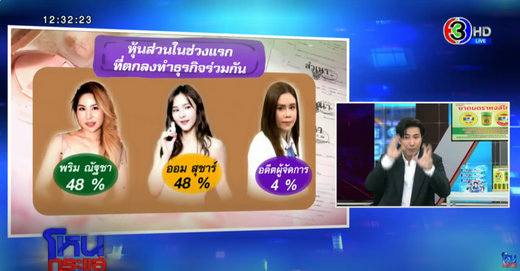 - ในตอนแรกที่คุยกันก่อนเซ็นต์สัญญาคุยกันไว้ที่ “ศสา” ถือหุ้น 10 เปอร์เซ็นต์ และ “พริม” และ “ออม” ถือหุ้นคนละ 45 เปอร์เซ็นต์ เวลาผ่านไป “พริม” ขอแบ่งสัดส่วนใหม่ในภายหลังโดยลดหุ้นของ “ศสา” เหลือ 4 เปอร์เซ็น ของ “พริม” เพิ่มเป็น 51 เปอร์เซ็นต์ ของ “ออม” คงเหลือ 45 เปอร์เซ็นต์เท่าเดิม