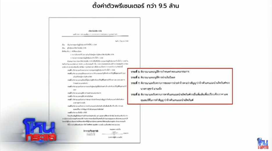 - ในส่วนของมูลค่าพรีเซ็นเตอร์ 9.5 ล้านบาท “ออม” ชี้แจงว่าไม่ได้ทำจ่ายตัวเอง ตั้งมาเพื่อให้บริษัทมีต้นทุนแฝงอะไรบ้างก่อนจะได้กำไร ยันว่าไม่ได้รับ ไม่ได้ในส่วนของพรีเซ็นเตอร์