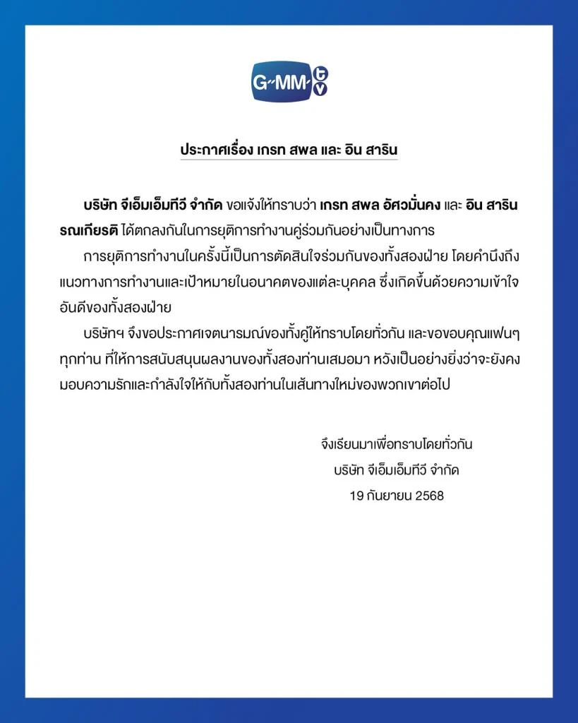 ซึ่งค่าย ”GMMTV” ร่อนจดหมายประกาศว่า “บริษัท จีเอ็มเอ็มทีวี จำกัด ขอแจ้งให้ทราบว่า เกรท สพล อัศวมั่นคง และ อิน สาริน รณเกียรติ ได้ตกลงกันในการยุติการทำงานคู่ร่วมกันอย่างเป็นทางการ