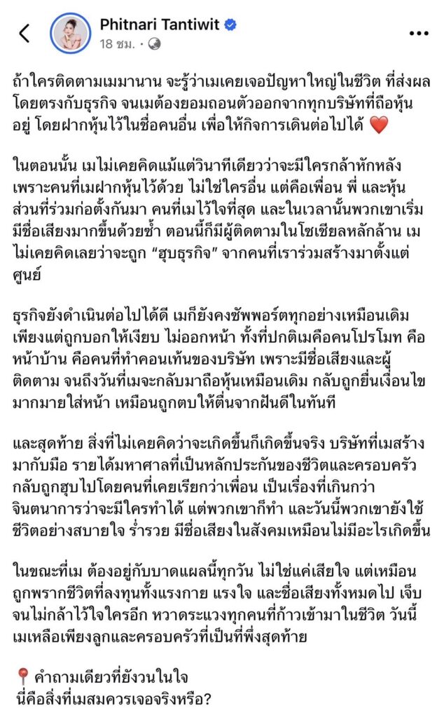 “ถ้าใครติดตามเมมานาน จะรู้ว่าเมเคยเจอปัญหาใหญ่ในชีวิต ที่ส่งผลโดยตรงกับธุรกิจ จนเมต้องยอมถอนตัวออกจากทุกบริษัทที่ถือหุ้นอยู่ โดยฝากหุ้นไว้ในชื่อคนอื่น เพื่อให้กิจการเดินต่อไปได้
