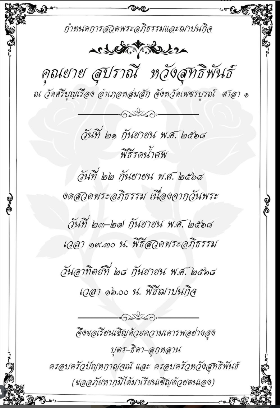 “ขอความกรุณาทุกท่าน งดแชร์รูปภาพ แจ้งข่าวสาร ลงในกลุ่ม และเพจ ต่างๆในโซเชียลมีเดีย ด้วยความเคารพต่อประสงค์ของคุณยายของเรา และทางเจ้าภาพมีความเกรงใจแขกทุกท่าน ในช่วงเวลานี้ ขอขอบพระคุณทุกกำลังใจและความเข้าใจจากทุกท่านมา ณ ที่นี่ด้วย ด้วยความเคารพอย่างสูง” กำหนดการต่างๆจะแจ้งให้ทุกท่านทราบเร็วๆนี้นะครับ
