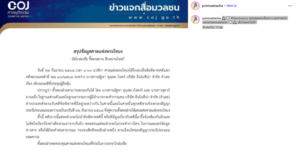 - “พริม” ได้ออกมาโพสต์สรุปข้อมูลศาลแพ่งพระโขนง นัดไกล่เกลี่ย ชี้สองสถาน สืบพยาน พร้อมแคปชั่น ‘🙏🏻 #fleenbeauty ขอบคุณทุกเรื่องราว ทุกกำลังใจ และทุกๆคนเลยนะคะ 🤍🙏🏻 เติบโตต่อไปน้า