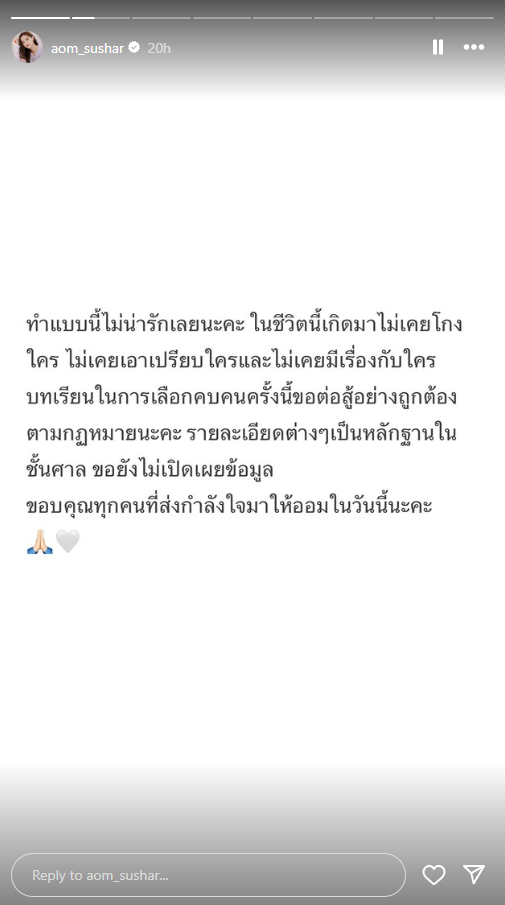 - “ออม สุชาร์” ออกมาโสต์ ข้อความผ่านสตอรี่ถึงเรื่องราวที่เกิดขึ้นว่า “ทำแบบนี้ไม่น่ารักเลยนะคะ ในชีวิตนี้เกิดมาไม่เคยโกงใคร ไม่เคยเอาเปรียบใครและไม่เคยมีเรื่องกับใคร บทเรียนในการเลือกคบคนครั้งนี้ขอต่อสู้อย่างถูกต้องตามกฎหมายนะคะ รายละเอียดต่างๆ เป็นหลักฐานในชั้นศาล ขอยังไม่เปิดเผยข้อมูล ขอบคุณทุกคนที่ส่งกำลังใจมาให้ออมในวันนี้นะคะ”