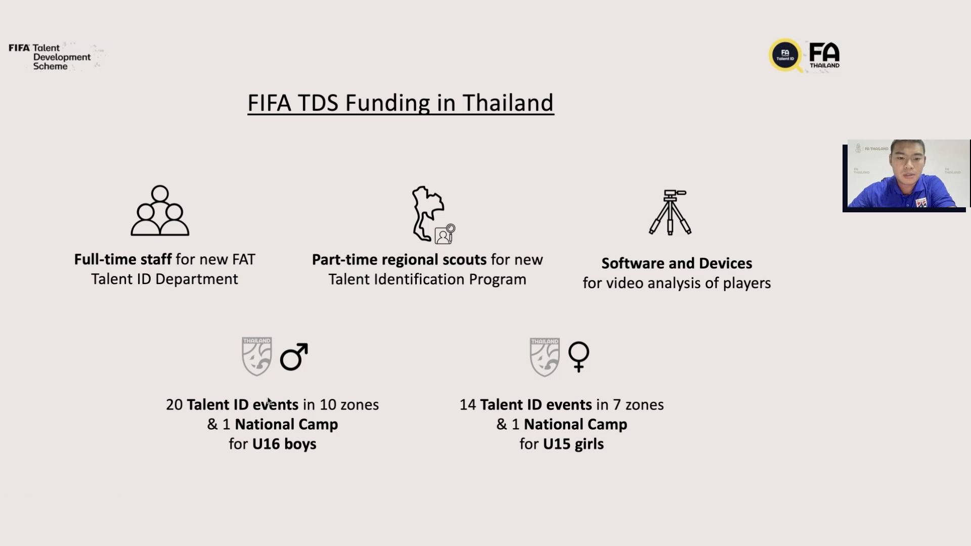 สำหรับ การเฟ้นหานักกีฬาในโครงการทาเลนต์ ไอดี ของ ฟีฟ่า ประเทศไทยฯ จัดขึ้นมาอย่างต่อเนื่องเป็นปีที่ 3 โดยพยายามสร้างแผนกคัดเลือกผู้เล่น เครือข่ายแมวมองภูมิภาคกระจายไปทั่วทุกภูมิภาค เพื่อให้ครอบคลุมพื้นที่ในการหานักเตะที่มีพรสวรรค์ให้ได้มากขึ้น ผสมผสานกับ การใช้เทคโนโลยีกล้องวิดิโอ ในการวิเคราะห์รายบุคคลของนักกีฬา และการสร้างฐานข้อมูลเยาวชน รวมถึงการประสานงานกับ โรงเรียน, สโมสร, และสถาบันสอนฟุตบอลต่างๆ เพื่อให้ได้นักเตะที่ดีที่สุด สำหรับการลงพื้นที่กิจกรรมคัดเลือก Talent ID รอบภูมิภาคทั่วประเทศ และการเก็บตัวรอบสุดท้ายระดับประเทศ เพื่อสร้างเยาวชนทีมชาติในรุ่นอายุไม่เกิน 17 ปี ที่มีภารกิจไปฟุตบอลโลกในทุกๆปี ต่อไป