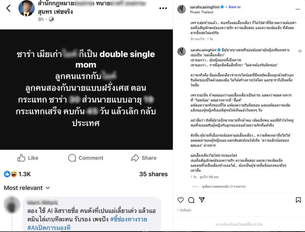 และได้เขียนใต้คอมเมนต์เพิ่มเติมว่า “มีผู้ชายบางคนที่ชอบด้อยค่าผู้หญิงเพียงเพราะเธอเป็น “แม่เลี้ยงเดี่ยว” เขามองว่า… ผู้หญิงแบบนี้เป็นภาระ