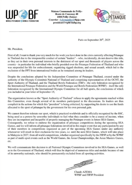 ต่อมา สหพันธ์เปตองนานาชาติ (FIPJP) ส่งหนังสือถึงคณะกรรมการโอลิมปิคแห่งประเทศไทยฯ สั่งห้ามประเทศไทยจัดการแข่งขันกีฬาเปตองในมหกรรมกีฬาซีเกมส์ 2025 ปลายปีนี้ โดยเนื้อหาระบุว่า การกีฬาแห่งประเทศไทย (กกท.) ยังคงสนับสนุนสมาคมกีฬาเปตองแห่งประเทศไทยฯ ชุดที่ถูกสหพันธ์ลงโทษแบน และแม้จะมีการแต่งตั้งคณะกรรมการกลางขึ้นมาแล้วก็ยังไม่ยอมรับ พร้อมทั้งยืนยันว่าหากชาติใดส่งนักกีฬาเข้าร่วมการแข่งขันก็จะถูกลงโทษแบน 2 ปี