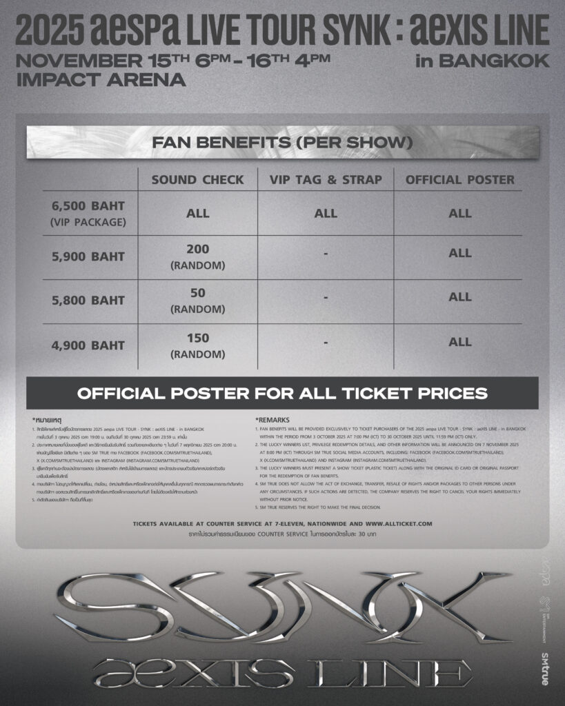 เมื่อความร่วมมือระหว่าง aespa (เอสป้า) และ MY (มาย) เริ่มต้นขึ้น แกนกลางที่อยู่เหนือทุกจินตนาการจะถูกค้นพบอย่างน่าตื่นตาตื่นใจที่สุดในวันที่มีความหมายอันน่าจดจำนี้ ณ คอนเสิร์ต ‘2025 aespa LIVE TOUR – SYNK : aeXIS LINE – in BANGKOK’ เปิดจำหน่ายบัตรรอบสมาชิก “MY” Membership (GL) Pre-Sale ในวันศุกร์ที่ 3 ตุลาคม 2025 เวลา 19:00 น. – 23:59 น., รอบสมาชิก JOY CLUB Pre-Sale วันเสาร์ที่ 4 ตุลาคม 2025 เวลา 11:00 น. – 15:59 น. และรอบบุคคลทั่วไป วันอาทิตย์ที่ 5 ตุลาคม 2025 ตั้งแต่เวลา 11:00 น. เป็นต้นไป ทางเคาน์เตอร์เซอร์วิสในร้าน 7-Eleven ทุกสาขาทั่วประเทศ และทางเว็บไซต์ www.allticket.com/event/aespa_SYNK_aeXISLINE_in_BANGKOK บัตรราคา 6,500 (VIP PACKAGE) / 5,900 (บัตรยืน) / 5,800 / 4,900 (บัตรยืน) / 3,900 / 2,900 / 2,200 บาท พร้อมสิทธิพิเศษสำหรับผู้ซื้อบัตร ติดตามข่าวสารและรายละเอียดเพิ่มเติมของคอนเสิร์ตได้ทางบัญชีโซเชียลมีเดียต่าง ๆ ของ SM True : เฟซบุ๊ก facebook.com/smtruethailand, อินสตาแกรม instagram.com/smtruethailand, เอ็กซ์ x.com/SMTrueThailand และ TikTok (ติ๊กต๊อก) tiktok.com/@smtruethailand สอบถามข้อมูลเพิ่มเติมเกี่ยวกับการซื้อบัตรได้ทาง Counter Service : อีเมล [email protected] และไลน์ออฟฟิเชียล @counterservice