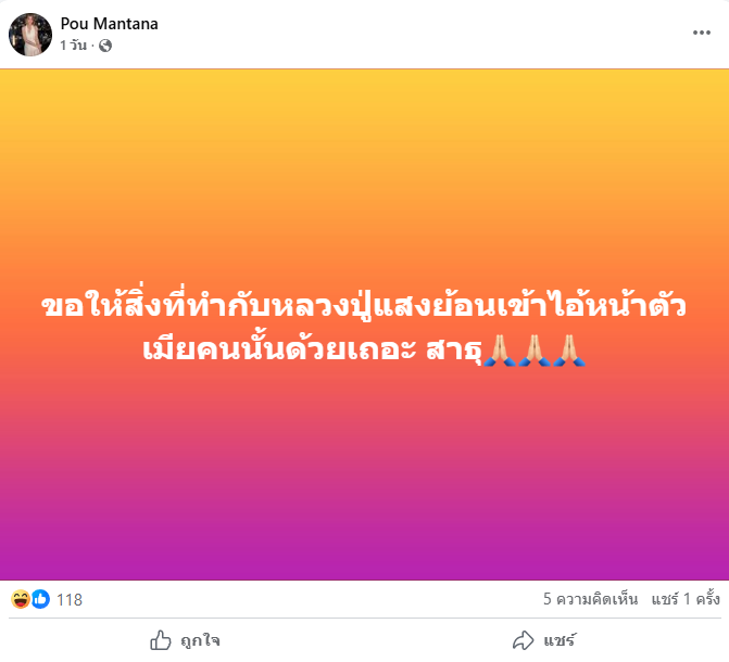 “ขอให้สิ่งที่ทำกับหลวงปู่แสงย้อนเข้าไอ้หน้าตัวเมียคนนั้นด้วยเถอะ สาธุ”