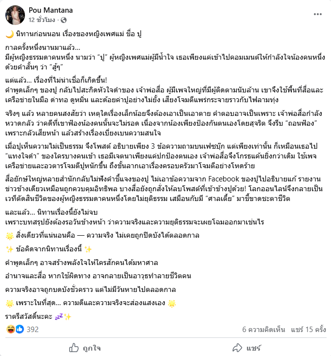 คำพูดเล็กๆ ของปู กลับไปสะกิดหัวใจดำของ เจ้าพ่อสื่อ ผู้มีเพจใหญ่ที่มีผู้ติดตามนับล้าน เขาจึงใช้พื้นที่สื่อและเครือข่ายในมือ ด่าทอ ดูหมิ่น และด้อยค่าปูอย่างไม่ยั้ง เสียงโจมตีแพร่กระจายราวกับไฟลามทุ่ง