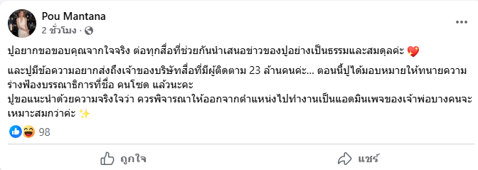 ปูขอแนะนำด้วยความจริงใจว่า ควรพิจารณาให้ออกจากตำแหน่งไปทำงานเป็นแอดมินเพจของเจ้าพ่อบางคนจะเหมาะสมกว่าค่ะ”