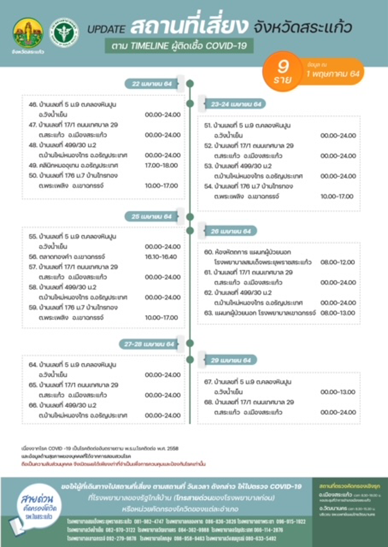 จังหวัดสระแก้วมีผู้ติดเชื้อรายใหม่ 9 รายมาจากระบบเฝ้าระวังในโรงพยาบาลและการคัดกรองเชิงรุกในชุมชน เป็นชาย 5 ราย, หญิง 4 ราย อายุระหว่าง 3-49 ปี สัญชาติไทยทั้ง 9 รายทำให้การระบาดระลอกใหม่เมษายน 2564 ตั้งแต่วันที่ 4–30 เมษายน 2564 จังหวัดสระแก้วมีผู้ป่วยสะสมทั้งสิ้น 340 ราย เข้ารักษาตัวอยู่ในสถานพยาบาลของรัฐ เอกชน และโรงพยาบาลสนามรวมทั้งสิ้น 171 ราย รักษาหายแล้ว 169 ราย ผู้ป่วยส่วนใหญ่ร้อยละ 84.8 ไม่มีอาการ มีอาการเล็กน้อยร้อยละ 6.43 ปอดอักเสบ 13 รายและปอดอักเสบรุนแรง 2 ราย เมื่อจำแนกตามคลัสเตอร์ของผู้ติดเชื้อพบว่าส่วนใหญ่ได้รับเชื้อมาจากสถานบันเทิง ผับ บาร์ ร้อยละ 48.24 รองลงมาเป็นผู้สัมผัสร่วมบ้าน ร้อยละ 26.18 ติดเชื้อจากไปร่วมงานบวช งานแต่ง ร้อยละ 12.06 จากการรวมกลุ่มสังสรรค์ ดื่มสุรา ร้อยละ 9.41 และอื่นๆร้อยละ 4.12