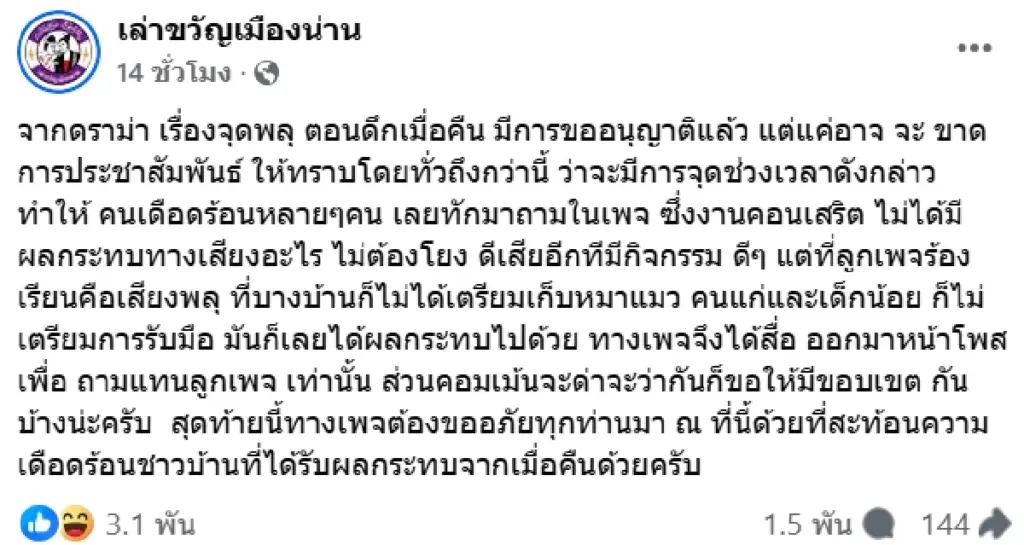 “ขออนุญาตกราบขอโทษและใช้พื้นที่ในการชี้แจง จากเพจเล่าขวัญเมืองน่าน ตามที่เพจเล่าขวัญเมืองน่านได้เผยแพร่โพสต์เกี่ยวกับการจุดพลุในงานคอนเสิร์ตที่ผ่านมา ซึ่งสร้างความไม่สบายใจกับหลาย ๆ ท่านนั้น ทางทีมแอดมินขอเรียนชี้แจงว่า เหตุการณ์ดังกล่าวเกิดจากความผิดพลาดในการตัดสินใจส่วนตัวของแอดมินผู้ดูแลเพจ นั่นก็คือผม ส่งผลให้การสื่อสารคลาดเคลื่อนเป็นวงกว้าง และการกระทำดังกล่าวมิได้พิจารณาไตร่ตรองให้ถ้วนถี่อย่างรอบคอบ ถึงผลกระทบในด้านลบที่ตามมา ผมในฐานนะแอดมินเพจเล่าขวัญเมืองน่าน ขอกราบขอโทษทุกท่านจากใจจริงและขอน้อมรับในความผิดพลาดครั้งนี้แต่เพียงผู้เดียว ทั้งนี้จะนำบทเรียนนครั้งนี้ ไปปรับปรุงในการนำเสนอสื่อต่างๆให้ระมัดระวังมากขึ้น เพื่อไม่ให้เกิดเหตุการณ์แบบนี้อีก