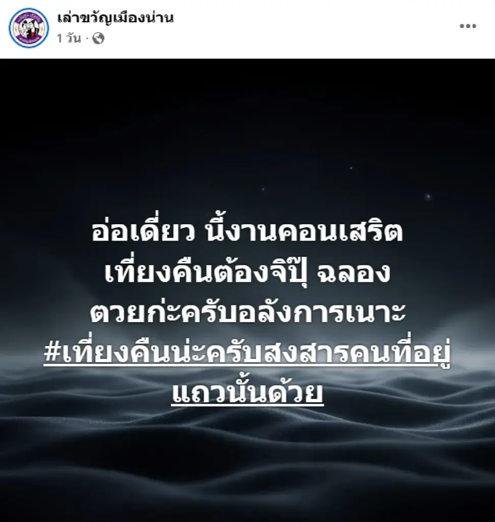 – โดยจุดเริ่มต้น ของเรื่อง เกิดจากที่เพจดังเล่าขวัญเมืองน่าน ออกมาโพสต์แรง ว่า “อ่อเดี๋ยวนี้งานคอนเสิร์ตเที่ยงคืนต้องจิปุ๊ฉลองตวยก่ะครับ อลังการเนาะ เที่ยงคืนน่ะครับ สงสารคนที่อยู่แถวนั้นด้วย” ซึ่งนี้คือสาเหตุ ที่ทำเอาชาวเน็ตถกเถียงกันสนั่น แบ่งออกเป็นสองฝ่าย ทั้งเห็นด้วย และไม่เห็นด้วย