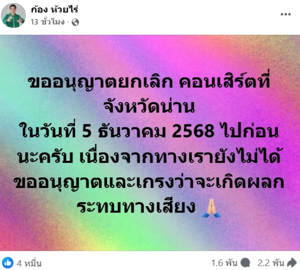 – ดูเหมือนเรื่องจะคลี่คลายไปในทิศทางที่ดีแล้ว แต่ไม่เป็นอย่างนั้น เมื่อนักร้องหนุ่ม “ก้อง ห้วยไร้” ได้ออกมาประกาศยกเลิกคอนเสิร์ตที่จัดขึ้นในวันที่5 ธันวาคม ที่จังหวัดน่าน โดยโพสต์ข้อความว่า “ขออญุญาตยกเลิกคอนเสิร์ตที่จังหวัดน่าน ในวันที่5ธันวาคม2568 ไปก่อนนะครับ เนื่องจากทางเรายังไม่ได้ขออญุญาต และเกรงว่าจะเกิดผลกระทบทางเสียง”