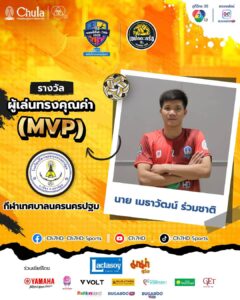 นอกจากนี้ คุณวิโรจน์ บุญศิริรุ่งเรือง ผู้ช่วยกรรมการผู้จัดการและรักษาการแทนผู้จัดการฝ่ายการเงินและบัญชี ร่วมมอบรางวัลพิเศษและโทรฟีต่าง ๆ ได้แก่ รางวัลนักกีฬาตัวทำยอดเยี่ยม ตกเป็นของ นายนนทนันท์ สมบัติหลาย รร.กีฬาจังหวัดสุพรรณบุรี รับทุนการศึกษา 5,000 บาท ขณะที่ รางวัลนักกีฬาตัวเสิร์ฟยอดเยี่ยม ตกเป็นของ นายกิตติพงษ์ พลหาญ รร.กีฬาจังหวัดอุบลราชธานี รับทุนการศึกษา 5,000 บาท พร้อมรับจักรยานนั่งตรง รุ่น 439B มูลค่า 10,000 บาท มอบโดย คุณสุมิตรา ดีวงษ์ ผู้แทนบริษัท มาราธอน (ประเทศไทย) จำกัด ส่วน รางวัลตัวชงยอดเยี่ยม เป็นของ นายวัชรพล คำแก้ว รร.กีฬาจังหวัดสุพรรณบุรี รับทุนการศึกษา 10,000 บาท มอบโดย คุณปราโมทย์ ธูปบูชา หัวหน้าแผนกแบรนด์อีเวนท์และกิจกรรมพิเศษ ฝ่ายพัฒนาการตลาด บริษัท ประกันภัยไทยวิวัฒน์ จำกัด (มหาชน) ด้าน นายสกุลชัย ดับโศก รร.ท่าขอนยางพิทยาคม ได้รับ รางวัลผู้ฝึกสอนยอดเยี่ยม มอบโดย นายแพทย์ธีร์วศิษฐ์ ฉัตรศิริมงคล รองผู้อำนวยการ โรงพยาบาลบางปะกอก 1 มอบเงินรางวัล 10,000 บาท และแพ็กเกจตรวจสุขภาพ มูลค่า 15,000 บาท ขณะที่ นายเมธาวัฒน์ ร่วมชาติ จาก รร.กีฬาเทศบาลนครนครปฐม รับ รางวัลผู้เล่นทรงคุณค่า MVP ได้รับรางวัลจักรยานยนต์ยามาฮ่า ฟาซซิโอ้ ไฮบริด มูลค่า 52,900 บาท มอบโดย คุณน้ำเพชร ตรีศักดิ์ศรีสกุล ผู้จัดการกลุ่มกิจกรรมการตลาดและสปอนเซอร์ชิป บริษัท ไทยยามาฮ่า มอเตอร์ จำกัด และ คุณพัฒนพงค์ หนูพันธ์ กรรมการผู้จัดการ ช่อง 7HD มอบเสื้อ Jacket MVP จาก Volt และยังมีรางวัลพิเศษ รางวัลกองเชียร์ยอดเยี่ยม มอบโดย ดร.สีหศักดิ์ อารีราชการัณย์ เลขาธิการสมาคมกีฬาตะกร้อแห่งประเทศไทย จำนวน 4 รางวัล รวมมูลค่า 7,000 บาท เพื่อให้กำลังใจกองเชียร์ รางวัลชนะเลิศ เงินรางวัล 3,000 บาท ได้แก่ รร.ท่าขอนยางพิทยาคม จ.มหาสารคาม รองชนะเลิศ ได้แก่ รร.กีฬาเทศบาลนครนครปฐม รับเงินรางวัล 2,000 บาท และรางวัลรองชนะเลิศอันดับสอง รางวัลละ 1,000 บาท จำนวน 2 รางวัล ได้แก่ รร.กีฬาจังหวัดอุบลราชธานี และ รร.กีฬาจังหวัดสุพรรณบุรี