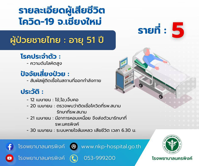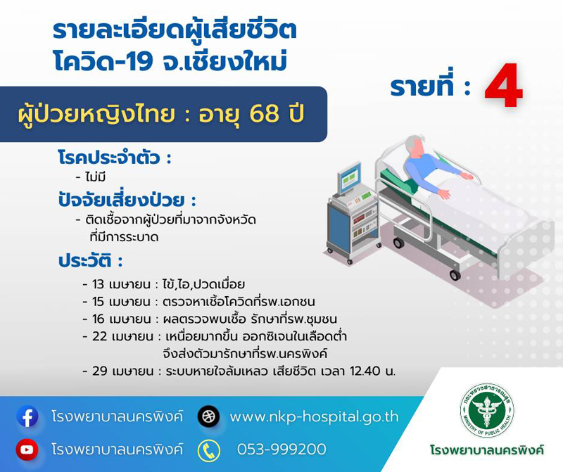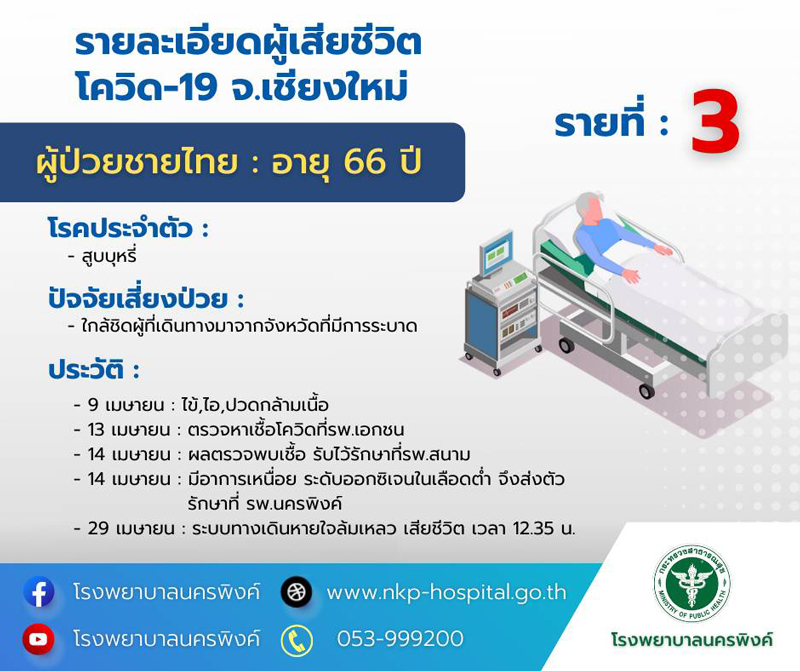 ส่วนรายที่ 3 เป็นชายไทย อายุ 51 ปี มีโรคประจำตัวความดันโลหิตสูง มีประวัติไปเล่นฟิตเนสในสถานออกกำลังกาย ก่อนช่วงสงกรานต์ และไม่ทราบความเสี่ยง มีอาการไข้ ไอ ในวันที่ 12 เมษายน ไปซื้อยามาทานเอง และรักษาตามคลินิก วันที่ 17 เมษายน มีไข้สูง และตรวจพบเชื้อในวันที่ 20 เมษายน จากนั้นวันที่ 21 เมษายน มีอาการหอบเหนื่อย จึงถูกส่งตัวเข้ารักษาที่โรงพยาบาลนครพิงค์ และได้เสียชีวิตลงด้วยระบบหายใจล้มเหลว ในวันที่ 30 เมษายน 2564