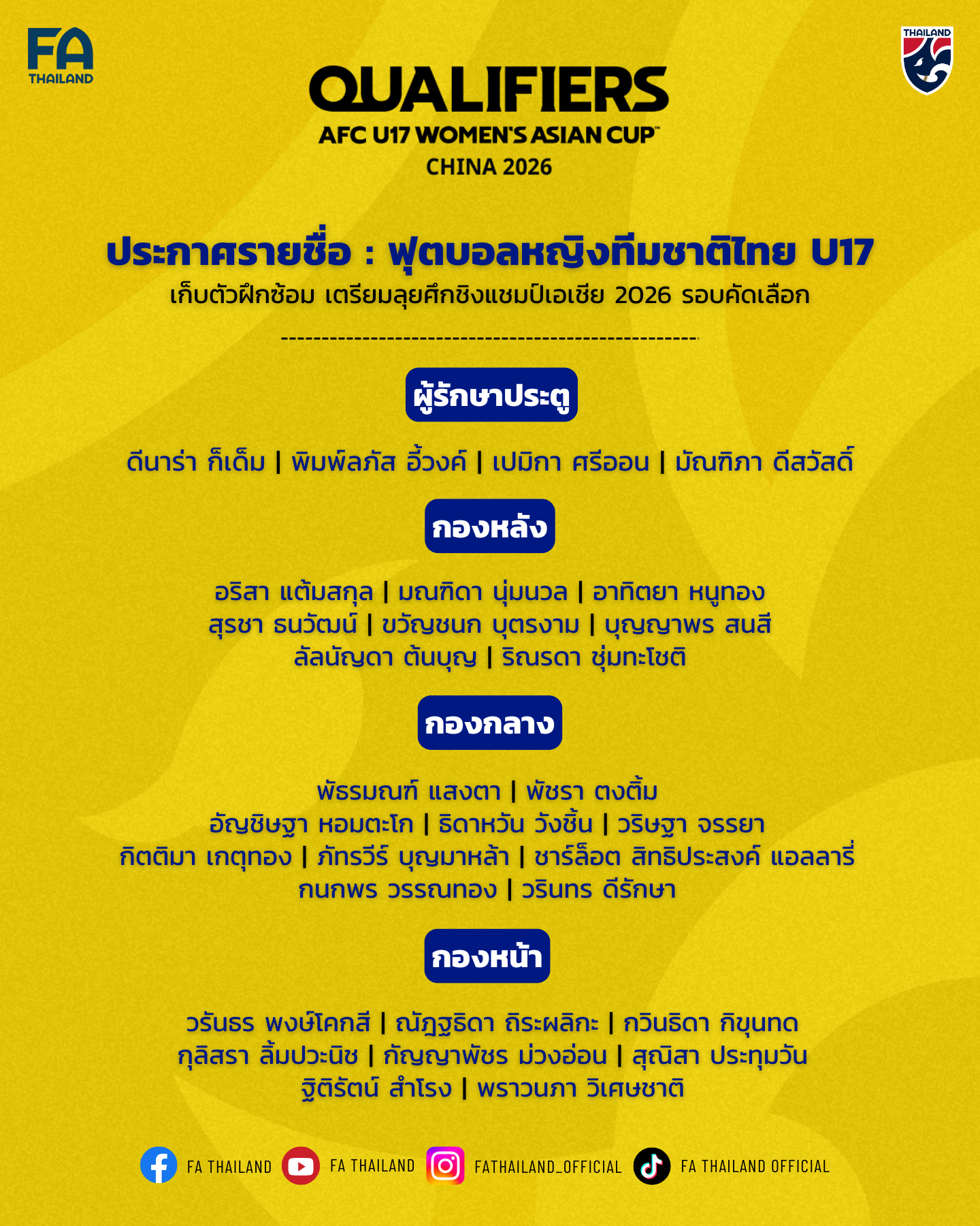 สมาคมกีฬาฟุตบอลแห่งประเทศไทย ในพระบรมราชูปถัมภ์ ประกาศรายชื่อ 30 นักฟุตบอลหญิงทีมชาติไทย รุ่นอายุไม่เกิน 17 ปี เก็บตัวฝึกซ้อม เพื่อเตรียมความพร้อมก่อนทำการแข่งขันฟุตบอลหญิงชิงแชมป์เอเชีย รุ่นอายุไม่เกิน 17 ปี 2026 รอบคัดเลือก (AFC U17 Women’s Asian Cup China 2026 Qualifiers) ระหว่างวันที่ 13-17 ตุลาคม 2568 ณ ชลบุรี สเตเดียม จังหวัดชลบุรี ภายใต้การคุมทัพของ “โค้ชมิ่ม” ธิดารัตน์ วิวาสุขุ