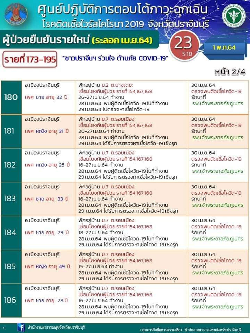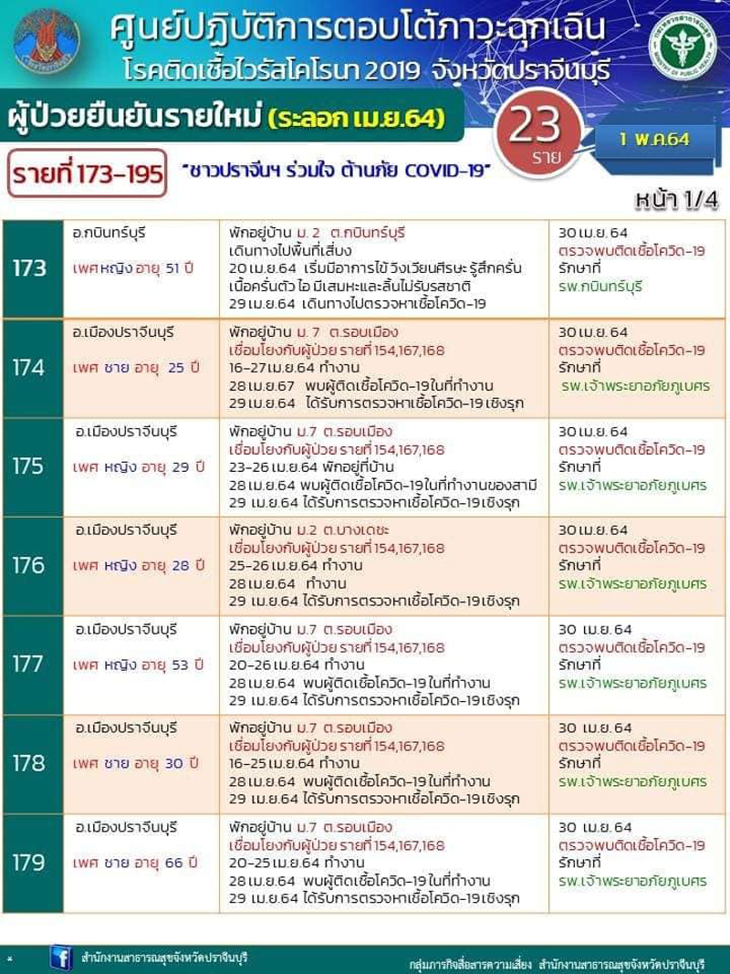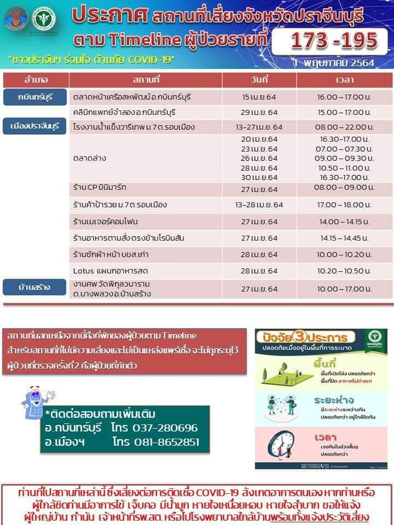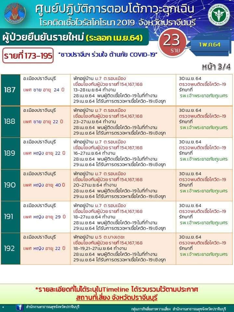 อนึ่ง รายละเอียด Timeline เบื้องต้น และสถานที่เสี่ยง ผู้ติดเชื้อ จำนวน 23 ราย (รายที่ 173 – 195) โดยรายที่ 172 -195 เป็นผู้ป่วยติดเชื้อจากโรงน้ำแข็ง ซึ่ง จ.ปราจีนบุรี มีแนวทางในการควบคุมการแพร่ระบาดของโรค ดังนี้