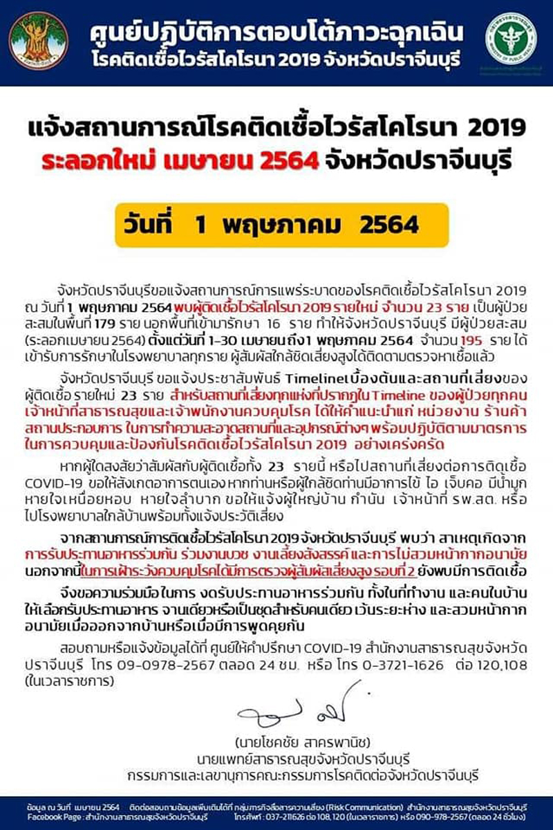 น.พ.โชคชัย สาครพานิช นายแพทย์สาธารณสุขจังหวัดปราจีนบุรี กรรมการและเลขานุการคณะกรรมการโรคติดต่อจังหวัดปราจีนบุรี มีประกาศ จ.ปราจีนบุรี สำนักงานสาธารณสุขจังหวัดปราจีนบุรี ขอรายงานข่าวกรณีโรคติดเชื้อไวรัสโคโรนา 2019 (COVID-19) ระลอก เมษายน 2564 จังหวัดปราจีนบุรี ประจำวันที่ 1 พฤษภาคม 2564 เวลา 14.00 น. น. ส่งตรวจสะสมระลอก เมษายน 2564 จำนวน 78 ราย (ผู้เข้าเกณฑ์สอบสวนโรค 6 ราย ผู้สัมผัสเสี่ยงสูง 71 ราย ตรวจก่อนผ่าตัด 1 ราย) รอผล 78 ราย รวมส่งตรวจระลอก เมษายน 2564 สะสมทั้งหมด 6,056 ราย วันนี้ จังหวัดปราจีนบุรี พบผู้ติดเชื้อ ระลอก เมษายน 2564 เพิ่ม จำนวน 23 ราย สะสมรวม 195 ราย รักษาอยู่โรงพยาบาล 156 ราย รักษาหายกลับบ้านแล้ว 39 ราย