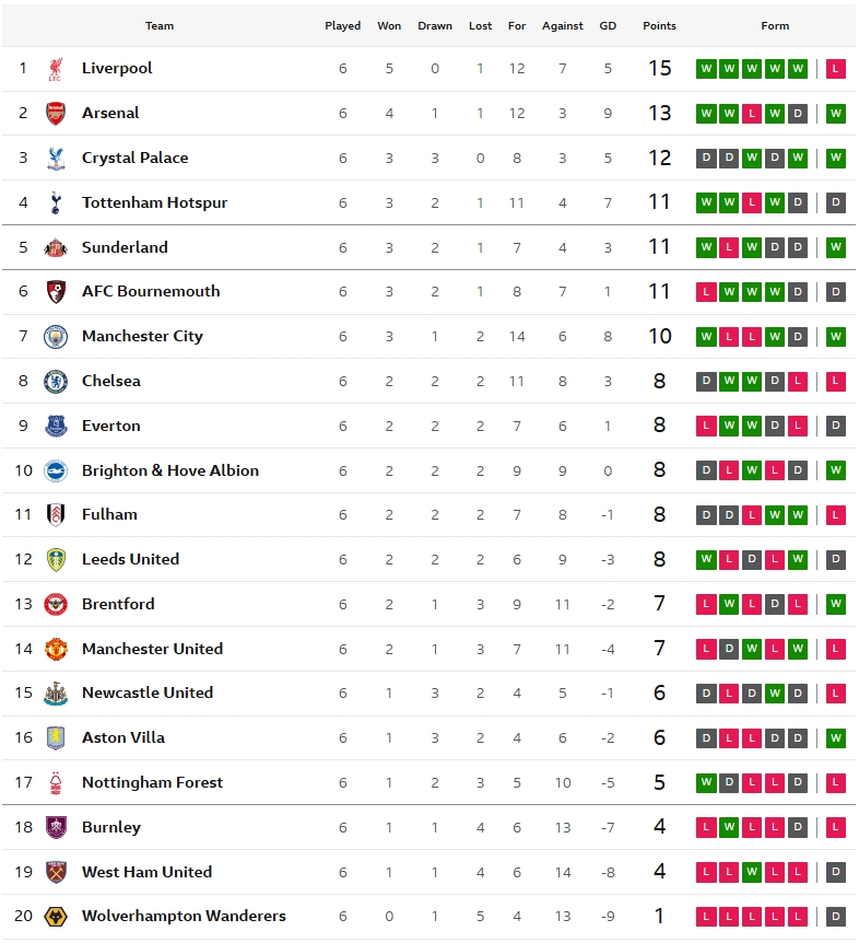 สำหรับผลตารางคะแนน สัปดาห์ที่ 6 ศึก พรีเมียร์ลีก 2025/26 มีดังนี้