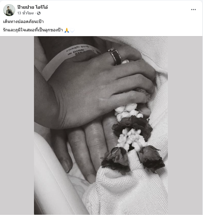 เรียกว่านับเป็นข่าวเศร้าครั้งยิ่งใหญ่สำหรับ นักร้องสุดฮอต “ป๊ายปาย โอริโอ้” หลังสูญเสียคุณพ่อจากไปอย่างสงบ โดย “ป๊ายปาย” ได้ออกมาแจ้งข่าว โพสต์ภาพขาวดำ ขณะกุมมืออีกมือหนึ่งไว้พร้อมพวงมาลัย และเขียนแคปชั่นว่า “เดินทางปลอดภัยนะป๊า รักและภูมิใจเสมอที่เป็นลูกของป๊า ” ท่ามกลางเพื่อนในวงการบันเทิง ร่วมถึงแฟนคลับต่างออกมาร่วมไว้อาลัย พร้อมส่งกำลังใจให้ “ป๊ายปาย” กันอย่างล้นหลาม