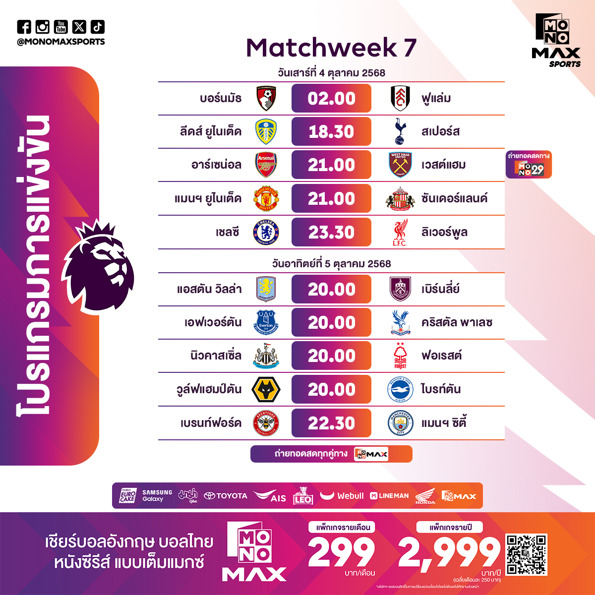 เปิดม่านกันตั้งแต่เช้ามืด วันเสาร์ที่ 4 ตุลาคม 2568 เวลา 02:00 น. (คืนวันศุกร์ที่ 3 ตุลาคม 2568) รับชมทาง Monomax กับ บอร์นมัธ เปิดบ้านรับมือ ฟูแล่ม ทั้งสองทีมต่างต้องการแต้มเพื่อขยับอันดับ ต่อเนื่องช่วงหัวค่ำ เวลา 18:30 น.ความมันส์ต่อเนื่องที่สนามเอลแลนด์ โร้ด ลีดส์ ยูไนเต็ด เปิดรังต้อนรับการมาเยือนของ ท็อตแน่ม ฮ็อตสเปอร์ ศึกนี้ยูงทองพร้อมสู้สุดใจ แต่ไก่เดือยทองกำลังลุ้นพื้นที่หัวตารางและมีทีเด็ดเกมรุกสุดอันตราย รับชมทาง Monomax