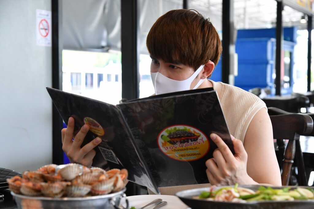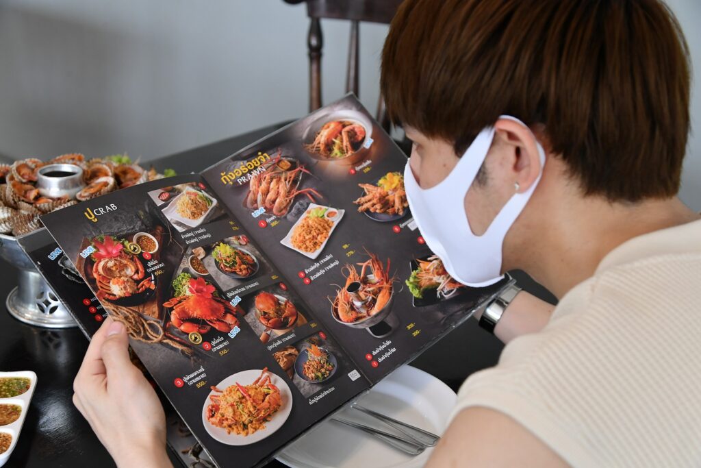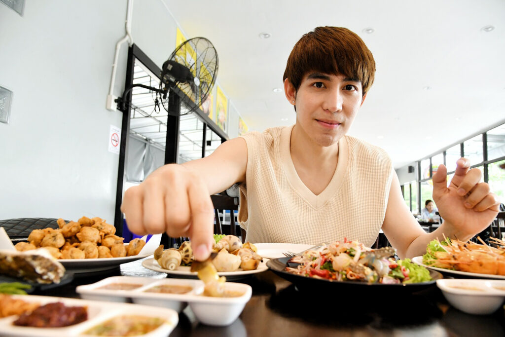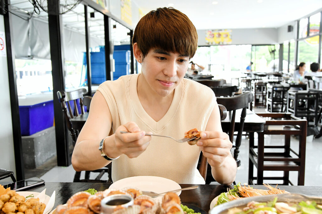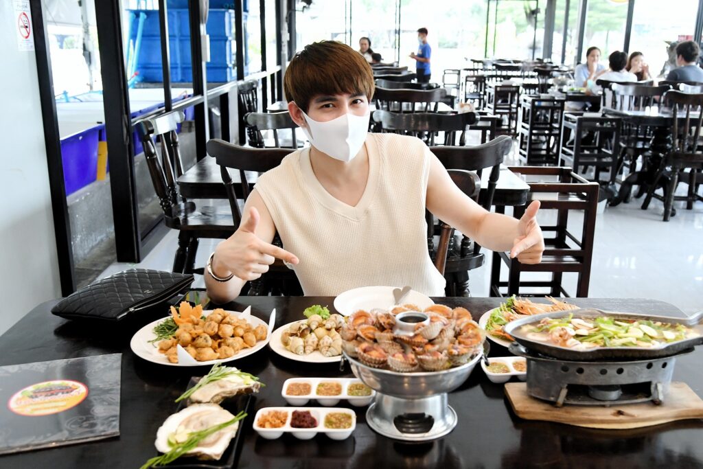 พอ “หนุ่มแม็ก” มาถึงร้านพร้อมการสวมแมสก์และปฏิบัติตามขั้นตอนด้านความปลอดภัยของร้านทุกอย่าง ก็ไม่รีรอที่จะสั่งอาหารยอดฮิตของทางร้าน “หอยนางรม พร้อมเครื่องเครียง, หอยแครงภูเขาไฟ, หอยแครงชุบแป้งทอด, หอยหวานเผา, หมึกนึ่งมะนาว, ยำปูกุ้ง, กุ้งเผา” ทานคู่กับน้ำจิ้ม 3 แบบ 3 รส “น้ำจิ้มมะขาม, น้ำจิ้มถั่วคั่ว, น้ำจิ้มซีฟู้ด” สูตรลับที่เจ้าของร้านโขลกด้วยตัวเองกับมือ พออาหารมาถึงโต๊ะครบแล้ว หนุ่มแม็กก็ทำการล้างมือก่อนถอดแมสก์ช่วงเวลาสั้นๆ เพื่อทานอาหารอย่างเอร็ดอร่อย
