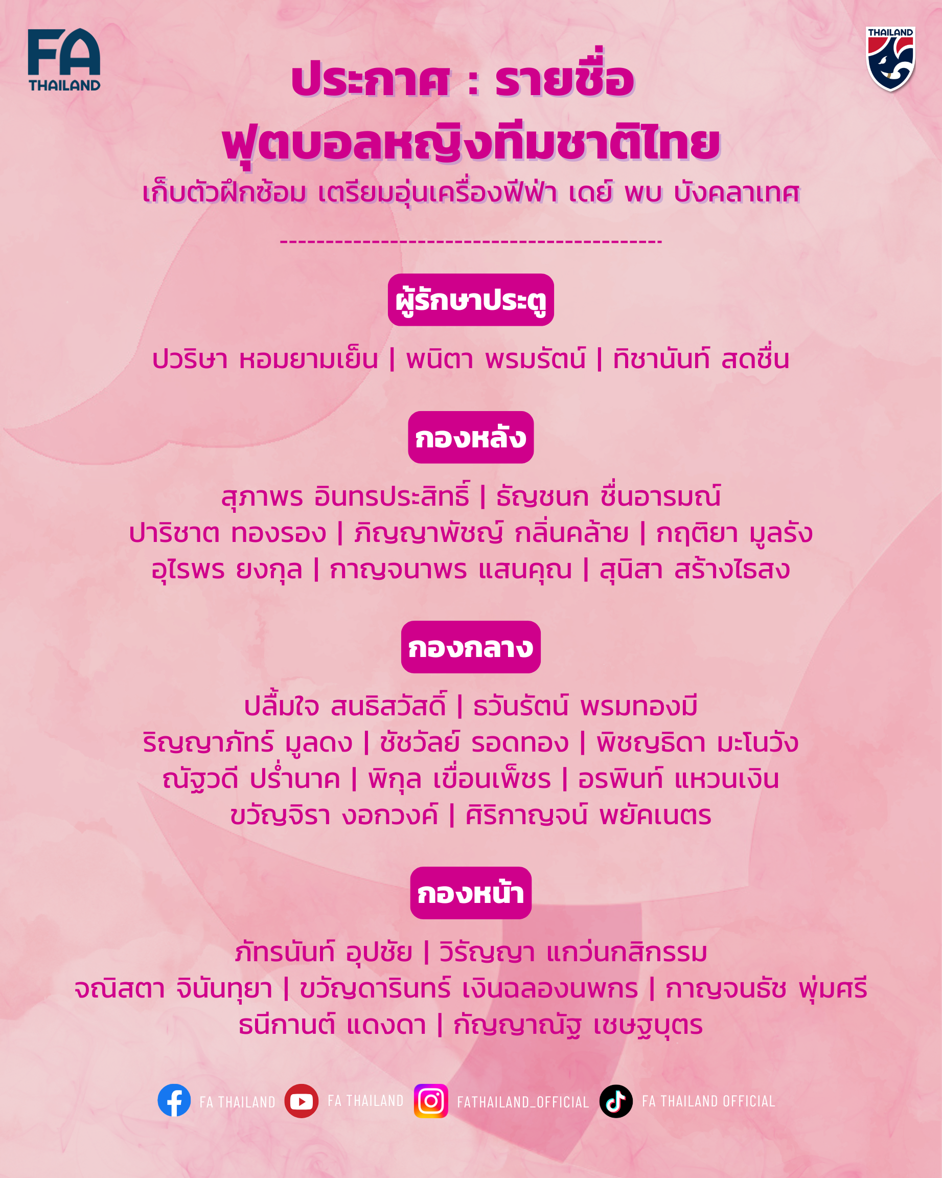 สมาคมกีฬาฟุตบอลแห่งประเทศไทย ในพระบรมราชูปถัมภ์ ประกาศรายชื่อ 28 นักฟุตบอลหญิงทีมชาติไทย เพื่อเก็บตัวฝึกซ้อม เตรียมความพร้อมก่อนทำการแข่งขันฟุตบอลอุ่นเครื่องตามปฏิทิน ฟีฟ่า เดย์ พบกับ ทีมชาติบังคลาเทศ ทั้งหมด 2 นัด ในวันที่ 24 และ 27 ตุลาคม 2568 ภายใต้การคุมทัพของ “โค้ชหนึ่ง” หนึ่งฤทัย สระทองเวียน หัวหน้าผู้ฝึกสอน
