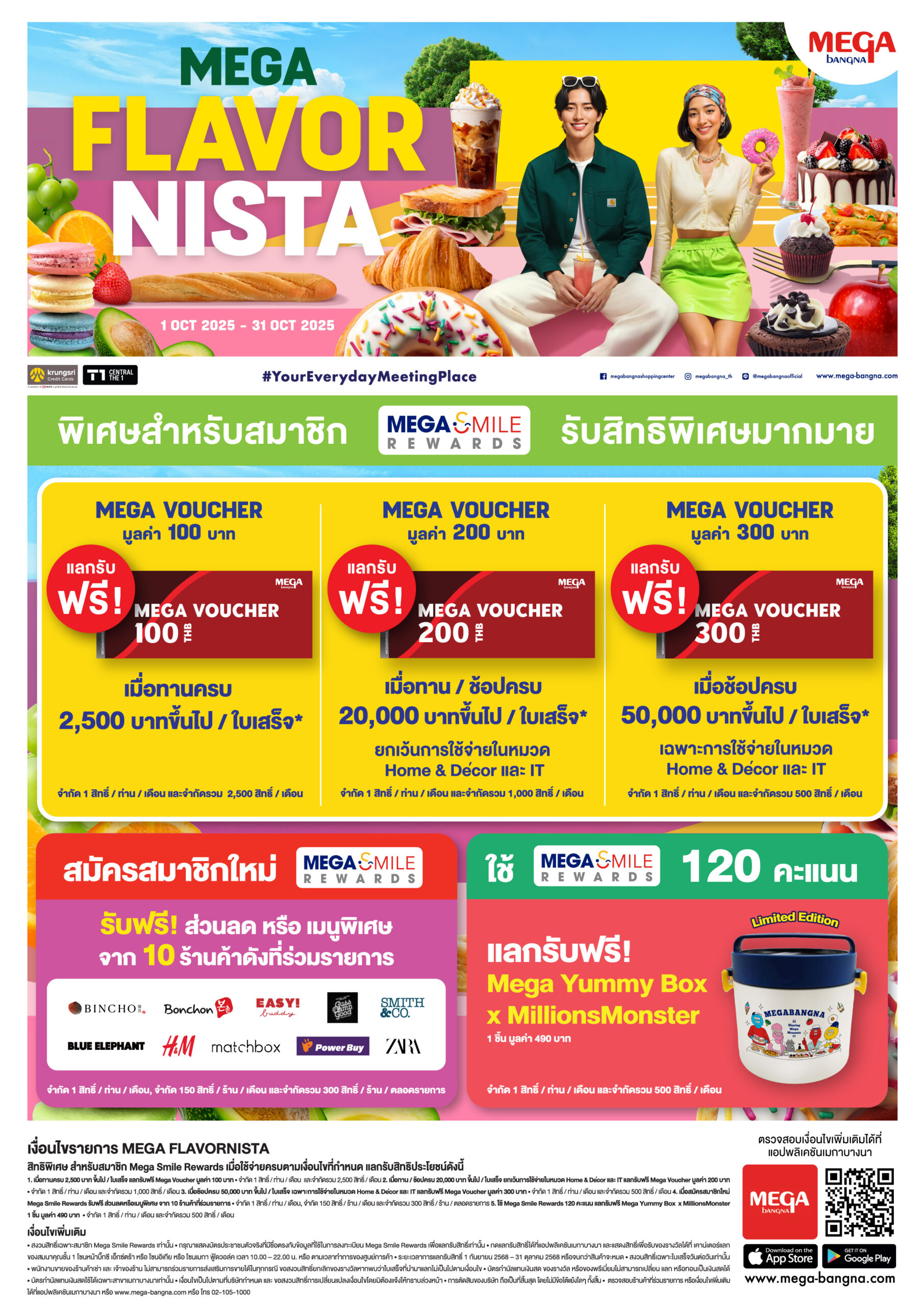 เปิดประสบการณ์ความคุ้มค่า เพียงสมัครสมาชิกเมกา สไมล์ รีวอร์ดส ระหว่างวันที่ 1 – 31 ตุลาคม 2568 รับฟรี! เมนูพิเศษหรือส่วนลดสุดเอ็กซ์คลูซีฟจากร้านค้าชั้นนำที่ร่วมรายการกว่า 10 แบรนด์ ทั้งสายกินและสายแฟชั่นไลฟ์สไตล์ อาทิ BINCHO, BONCHON, EASY BUDDY, GUSS DAMN GOOD, SMITH & CO., BLUE ELEPHANT, H&M, MATCHBOX, POWER BUY และ ZARA ซึ่งทุกท่านสามารถสมัครสมาชิกเมกา สไมล์ รีวอร์ดส ได้ง่าย สะดวก เพื่อสัมผัสประสบการณ์ความคุ้มค่าของการกินและช้อปปิ้งภายในเมกาบางนา