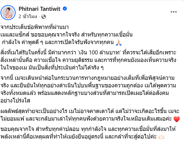 จากประเด็นข้อพิพาทที่ผ่านมา เมและแซก ขอขอบคุณจากใจจริง สำหรับทุกความเชื่อมั่นกำลังใจ คำพูดดี ๆ และการเปิดใจรับฟังจากทุกคน สิ่งที่เมได้รับในครั้งนี้ มีค่ามากกว่า ‘เงิน 100 ล้านบาท’ ที่ควรจะได้เสียอีกเพราะสิ่งเหล่านั้นคือ ความเชื่อใจ ความยุติธรรม และการที่ทุกคนยังมองเห็นความจริงในใจของเม มันเป็นสิ่งที่ประเมินค่าไม่ได้จริง ๆ จากนี้ เมจะเดินหน้าต่อในกระบวนการทางกฎหมายอย่างเต็มที่เพื่อพิสูจน์ความจริง และยืนยันให้ทุกอย่างดำเนินไปบนพื้นฐานของความถูกต้อง เมได้พูดความจริงทั้งหมดแล้ว พร้อมแสดงหลักฐานบางส่วนที่สามารถเปิดเผยได้ต่อสังคมอย่างโปร่งใส
