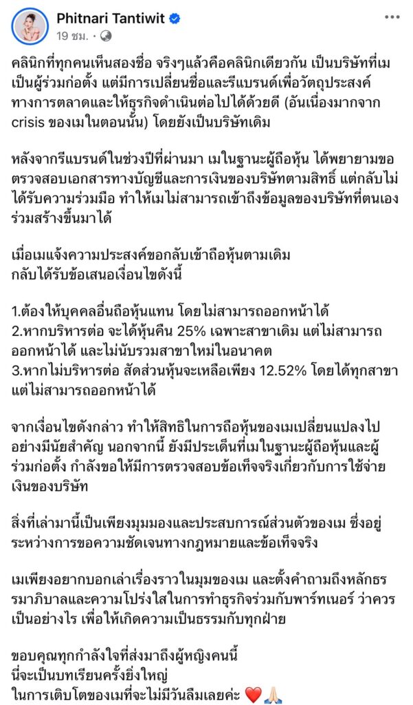 - จุดเริ่มต้นของเรื่องนี้ เกิดจากที่ “เม พรีมายา” ได้ออกมาโพสต์ข้อความถูกถอนชื่อออกจากผู้ถือหุ้นคลินิกซึ่งเป็นบริษที่เจ้าตัวร่วมก่อตั้ง