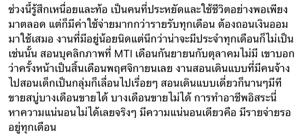 ล่าสุดเรียกว่าออกมาตัดพ้อ เมื่อช่วงนี้งานไม่ค่อยมี แถมรายจ่ายมากกว่ารายรับ โดยเจ้าตัวออกมาโพสต์ตัดพ้อว่า“ช่วงนี้รู้สึกเหนื่อยและท้อ เป็นคนที่ประหยัดและใช้ชีวิตอย่างพอเพียงมาตลอด แต่ก็มีค่าใช้จ่ายมากกว่ารายรับทุกเดือน ต้องถอนเงินออมมาใช้เสมอ งานที่มีอยู่น้อยนิดแต่นึกว่าน่าจะมีประจำทุกเดือนก็ไม่เป็นเช่นนั้น สอนบุคลิกภาพที่ MTI เดือนกันยายนกับตุลาคมไม่มี เขาบอกว่าครั้งหน้าเป็นสิ้นเดือนพฤศจิกายนเลย งานสอนเดินแบบที่มีคนจ้างไปสอนเด็กเป็นกลุ่มก็เลื่อนไปเรื่อยๆ สอนเดินแบบเดี่ยวก็นานๆ มีที ขายสบู่บางเดือนขายได้ บางเดือนขายไม่ได้ การทำอาชีพอิสระนี่หาความแน่นอนไม่ได้เลยจริงๆ มีความแน่นอนเดียวคือ มีรายจ่ายรออยู่ทุกเดือน”