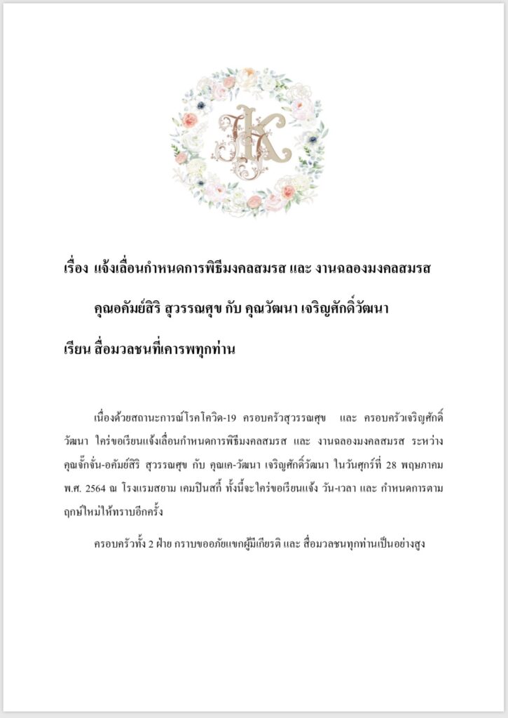 เรื่อง แจ้งเลื่อนกำหนดการพิธีมงคลสมรส และ งานฉลองมงคลสมรส