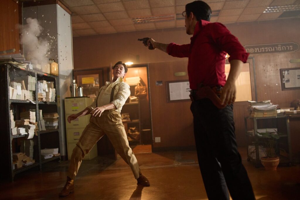 เรียกว่าวันนั้นคนเข้าฉากร่วมกันหลายร้อยชีวิตมากครับในเหตุการณ์วันนั้นก็จะมีเสือหลากหลายทิศมาเจอกันแล้วตะลุมบอนยิงกันกลางงาน ชุลมุนกันไปหมด ฉากเดือดมากครับ ยิงกันนัว เอฟเฟกต์ระเบิดเต็มไปหมด เป็นการทำงานที่คิวเยอะมาก คนเยอะมาก “พี่โขม” อยากได้ภาพกว้างๆ เห็นบรรยากาศหมด ส่ง