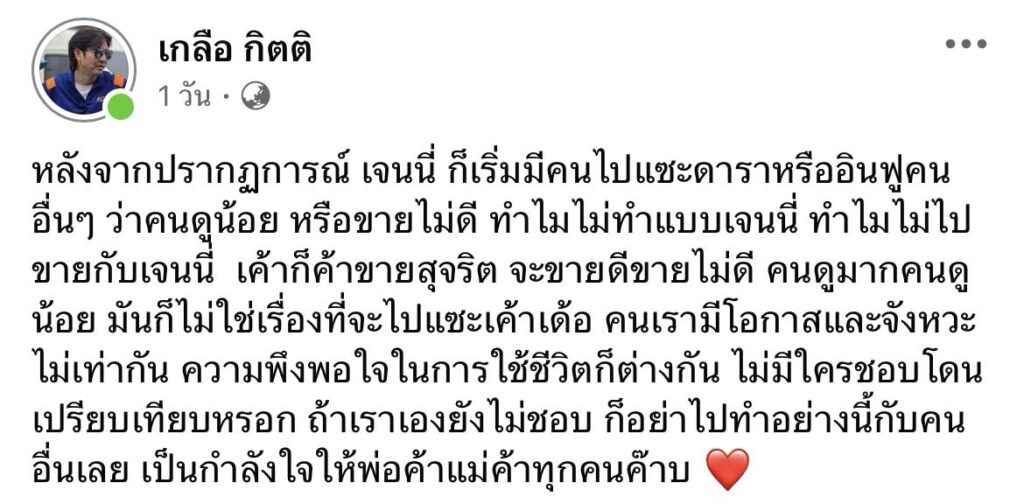 ปิดท้ายกันที่ พิธีกร ”เกลือ กิตติ“ ที่ออกมาฟาดเบาๆ หลังการไลฟ์สดของ “เจนนี่ รัชนก” เป็นกระแสตอบรับดีมาก ทั้งยอดขายและคนดูจึงทำให้ชาวเน็ตบางกลุ่มเข้ามาแซะดาราและอินฟลูท่านอื่นถึงคนดูน้อย ยอดขายไม่ดี โดย “เกลือ” เปิดเผยว่า “เค้าก็ค้าขายสุจริต จะขายดีขายไม่ดี คนดูมากคนดูน้อย มันก็ไม่ใช่เรื่องที่จะไปแซะเค้าเด้อ คนเรามีโอกาสและจังหวะไม่เท่ากัน ความพึงพอใจในการใช้ชีวิตก็ต่างกัน ไม่มีใครชอบโดนเปรียบเทียบหรอก ถ้าเราเองยังไม่ชอบ ก็อย่าไปทำแบบนั้นกับคนอื่นเลย เป็นกำลังใจให้พ่อค้าแม่ค้าทุกคนค๊าบ ❤️”