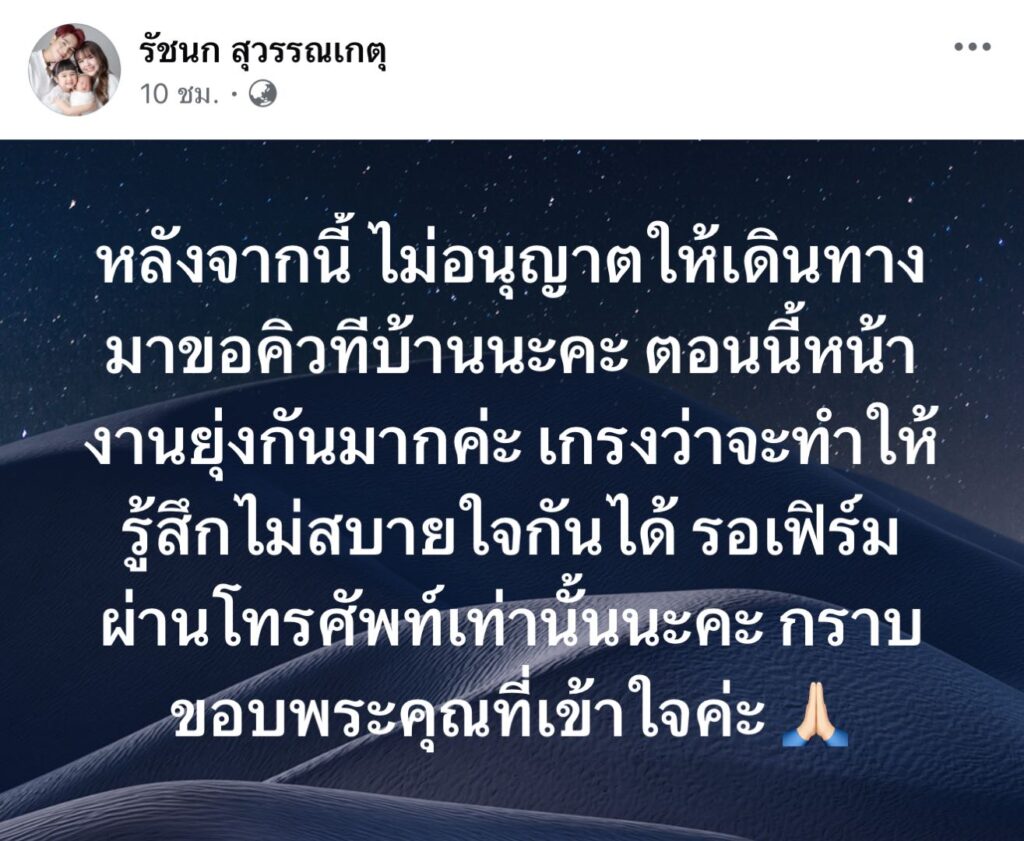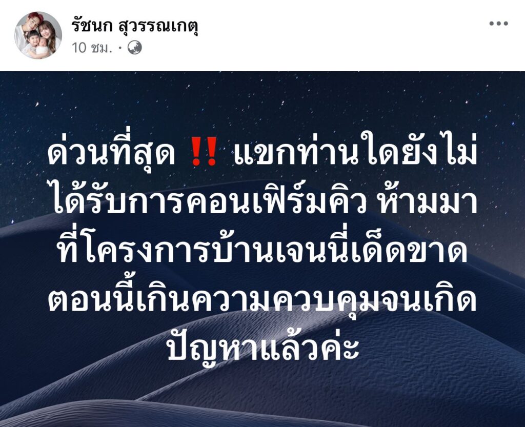 ที่โครงการบ้านเจนนี่เด็ดขาดตอนนี้เกินความควบคุมจนเกิดปัญหาแล้วค่ะ“ และอีกโพสต์ว่า “หลังจากนี้ ไม่อนุญาตให้เดินทางมาขอคิวทีบ้านนะคะ ตอนนี้หน้างานยุ่งกันมากค่ะ เกรงว่าจะทำให้รู้สึกไม่สบายใจกันได้ รอเฟิร์มผ่านโทรศัพท์เท่านั้นนะคะ กราบ ขอบพระคุณที่เข้าใจค่ะ”