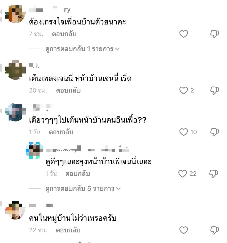 โดยเข้ามาคอมเมนต์แซะอาทิ “เพื่อนบ้านโครตใจดี , เพื่อนบ้านว่าไง ตี3 อะ ละเสียงไม่ดังรึคะ , เพื่อนบ้านเจนนี่ เป็นไงบ้าง , ขอถามคะไม่เสียงดังรบรวนเพื่อนบ้านข้างๆเหรอคะ , ส่งสารคนข้างบ้าน , สงสารคนที่ยุในหมู่บ้านนี้จัง เกรงใจกี่โมง”