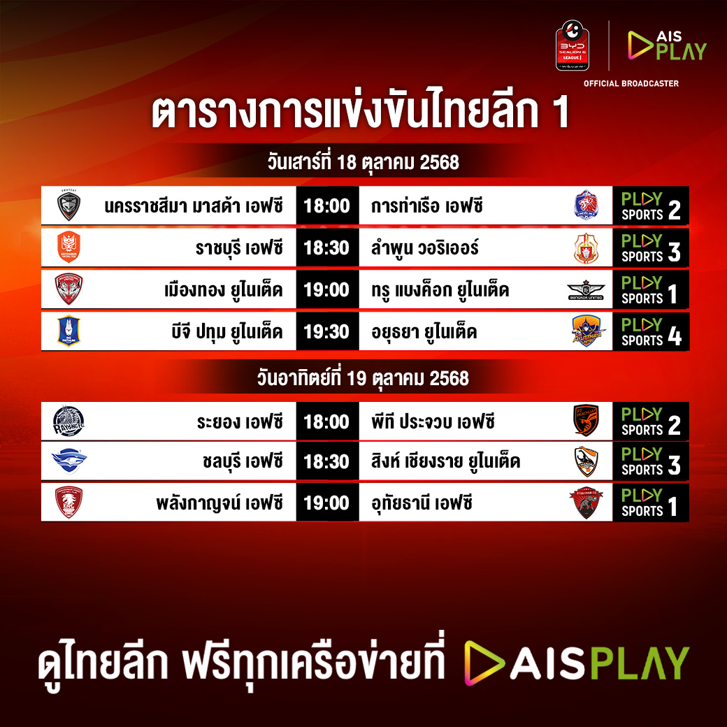 ดังนั้นไฮไลท์ในสัปดาห์นี้คงต้องยกให้คู่ระหว่าง “กิเลนผยอง” เมืองทอง ยูไนเต็ด ทีมอันดับ 9 ของตาราง ที่จะเปิดบ้านพบกับ “แข้งเทพ” ทรู แบงค็อก ยูไนเต็ด ทีมรองแชมป์เก่าและรองจ่าฝูง ที่ธันเดอร์โดม สเตเดียม ในวันเสาร์ที่ 18 ตุลาคม 2568 เวลา 19.00 น. ถ่ายทอดสดทางช่อง AIS PLAY SPORTS1