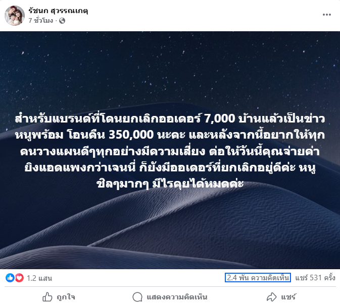 ล่าสุด “เจนนี่” โพสต์ถึงเจ้าของแบรนด์ดังกล่าวว่า “สำหรับแบรนด์ที่โดนยกเลิกออเดอร์ 7,000 บ้านแล้วเป็นข่าว หนูพร้อม โอนคืน 350,000 นะคะ และหลังจากนี้อยากให้ทุกคนวางแผนดีๆทุกอย่างมีความเสี่ยง ต่อให้วันนี้คุณจ่ายค่ายิงแอดแพงกว่าเจนนี่ ก็ยังมีออเดอร์ที่ยกเลิกอยู่ดีค่ะ หนูชิลๆมากๆ มีไรคุยได้หมดค่ะ”