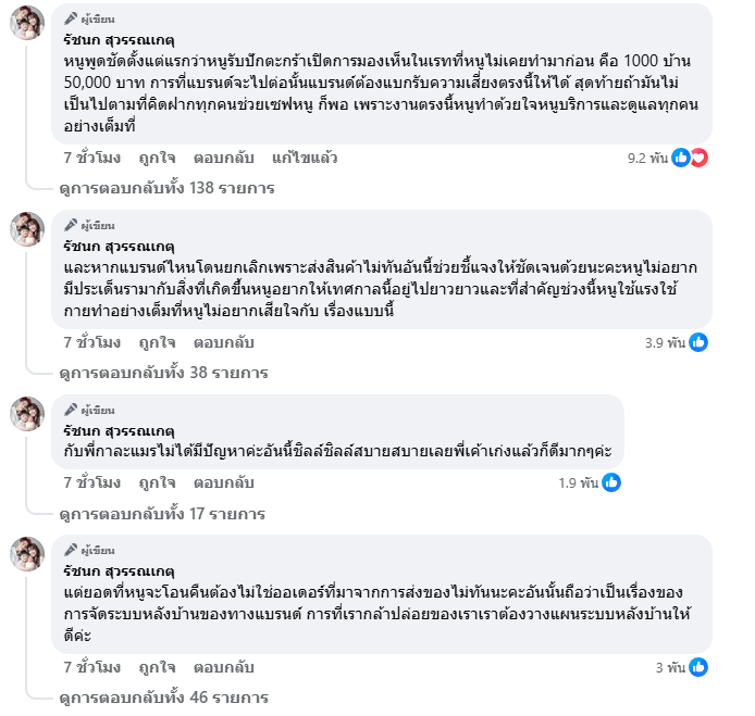 “แต่ยอดที่หนูจะโอนคืนต้องไม่ใช่ออเดอร์ที่มาจากการส่งของไม่ทันนะคะอันนั้นถือว่าเป็นเรื่องของการจัดระบบหลังบ้านของทางแบรนด์ การที่เรากล้าปล่อยของเราเราต้องวางแผนระบบหลังบ้านให้ดีค่ะ”