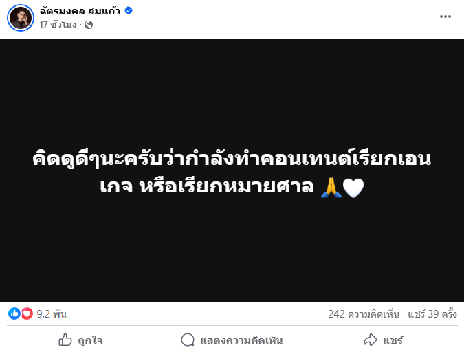 ขณะเดียวกัน “ยิว ฉัตรมงคล” ได้โพสต์ลอย ๆ ว่า “คิดดูดีๆนะครับว่ากำลังทำคอนเทนต์เรียกเอนเกจ หรือเรียกหมายศาล”