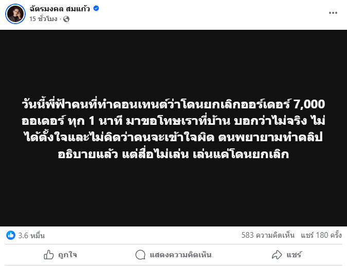และได้โพสต์ข้อความเพิ่มเติมว่า “วันนี้พี่ฟ้าคนที่ทำคอนเทนต์ว่าโดนยกเลิกออเดอร์ 7,000 ออเดอร์ ทุก 1 นาที มาขอโทษเราที่บ้าน บอกว่าไม่จริง ไม่ได้ตั้งใจและไม่คิดว่าคนจะเข้าใจผิด ตนพยายามทำคลิปอธิบายแล้ว แต่สื่อไม่เล่น เล่นแค่โดนยกเลิก”