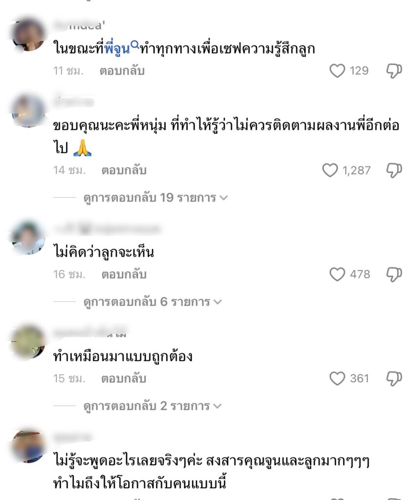 ท่ามกลางชาวเน็ตเข้ามาคอมเมนต์แซะแรงว่า , ขอบคุณนะคะพี่หนุ่ม ที่ทำไห้รู้ว่าไม่ควรติดตามผลงานพี่อีกต่อไป , ไม่คิดว่าลูกจะเห็น , ไม่รู้จะพูดอะไรเลยจริงๆค่ะ สงสารคุณจูนและลูกมากๆๆๆ ทำไมถึงให้โอกาสกับคนแบบนี้ , คือชอบผลงาน แยกแยะ ชอบเสียงเพลงเขา เอาไปเอามาก็ชอบไม่ลง การเป็นศิลปินมันจะต้องวางตัว , นั่งไลฟ์ๆดีก็ได้เห้อ , ทางนั้นหมดเวรหมดกรรมแล้ว