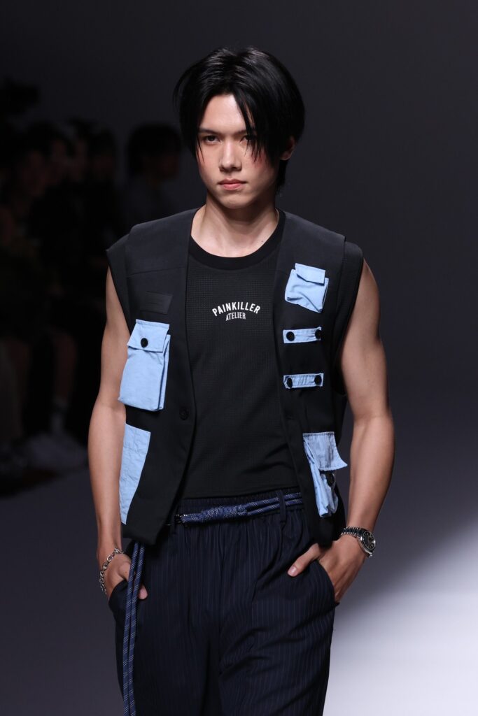หนุ่ม อเล็กซ์ ปรากฏตัวในลุคสุดเท่ ด้วยเสื้อแขนกุดสีดำแมทช์กับกางเกงสีกรมลายริ้ว เสริมลุคให้สมบูรณ์แบบด้วยการทับเสื้อกั๊กสีดำสุดมินิมอล จาก PAINKILLER Atelier