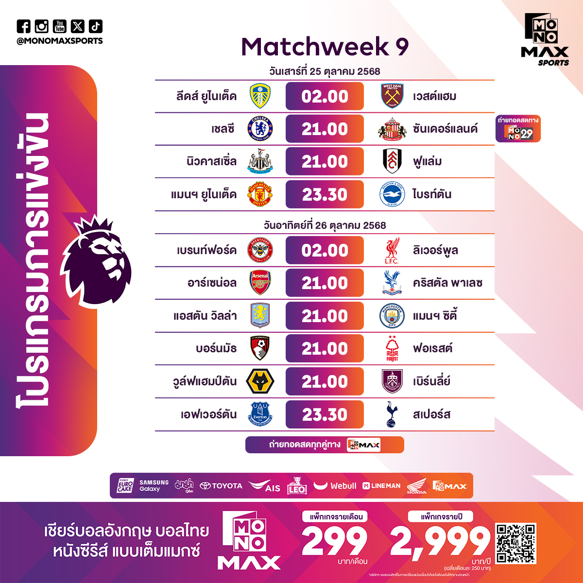 การแข่งขันฟุตบอลพรีเมียร์ลีก อังกฤษ ฤดูกาล 2025/26 เดินหน้าเข้าสู่ช่วงปลายเดือนตุลาคมอย่างเข้มข้น โดยสุดสัปดาห์นี้ระหว่างวันที่ 25–26 ตุลาคม 2568 บรรดาทีมยักษ์ใหญ่และทีมในกลุ่มท้ายตารางต่างลงสนามพร้อมหน้า ซึ่งหลายคู่มีความสำคัญต่อทั้งการลุ้นแชมป์และหนีตกชั้น ถ่ายทอดสดครบทุกคู่ทาง Monomax และบางคู่ผ่านหน้าจอ ช่อง MONO29