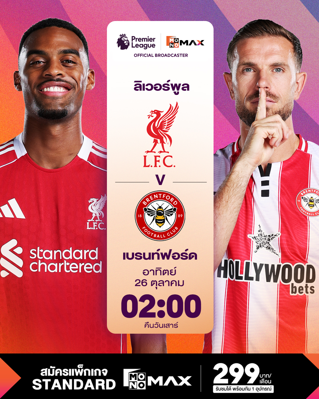 ก่อนจะปิดท้ายด้วย เวลา 02:00 น. ของวันอาทิตย์ที่ 26 ตุลาคม 2568 (คืนวันเสาร์ที่ 25 ตุลาคม 2568) “ผึ้งพิฆาต” เบรนท์ฟอร์ด เปิดบ้านต้อนรับ “หงส์แดง” ลิเวอร์พูล ซึ่งเกมนี้ลิเวอร์พูลมีเป้าหมายชัดเจนในการเก็บสามแต้มเพื่อตามจี้จ่าฝูงอย่างอาร์เซน่อล รับชมได้ที่ Monomax