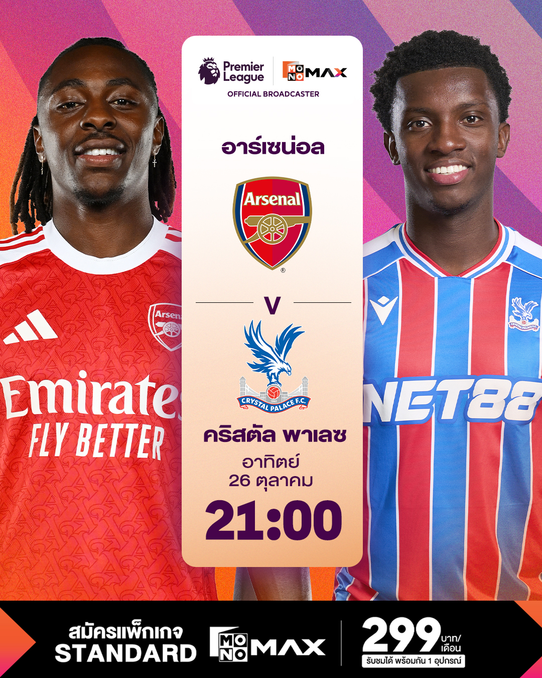 มันส์กันต่อในช่วงค่ำ วันอาทิตย์ที่ 26 ตุลาคม 2568 เวลา 21.00 น. รับชมทาง Monomax จะเป็นช่วงสำคัญของหลายทีม โดยเริ่มจากจ่าฝูง “ปืนใหญ่” อาร์เซน่อล จะเปิดเอมิเรตส์ สเตเดียม รับมือ คริสตัล พาเลซ เจ้าถิ่นต้องการเก็บสามแต้มเพื่อยึดตำแหน่งจ่าฝูงต่อเนื่อง