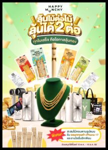 สำหรับแคมเปญ ลุ้นไม้ต่อไม้ ลุ้นได้ 2 ต่อ” Happy Munchy ฉลองครบรอบ 10 ปี จัดหนัก แจกจริง ทุกไม้ คือโอกาส ทุกใบเสร็จมีสิทธิ์ลุ้นทอง iPhone และของรางวัลอีกมากมาย โดยมีไฮไลท์ ต่อที่ 1: ทุกใบเสร็จจากการซื้อออมุก Happy Munchy จากร้านค้าที่ร่วมรายการ มีสิทธิ์ลุ้นสร้อยคอทองคํา และ ต่อที่ 2: สะสมไม้ให้ครบรูปแบบ ลุ้นรับของรางวัลใหญ่ทันที เช่น ออมุกทองคํา 1 บาท, iPhone 17, AirPods, Nintendo Switch และ ของรางวัลอื่นๆ กว่า 1,000 ชิ้น ตั้งแต่วันที่ 16 ตุลาคม – 16 ธันวาคม 2568
